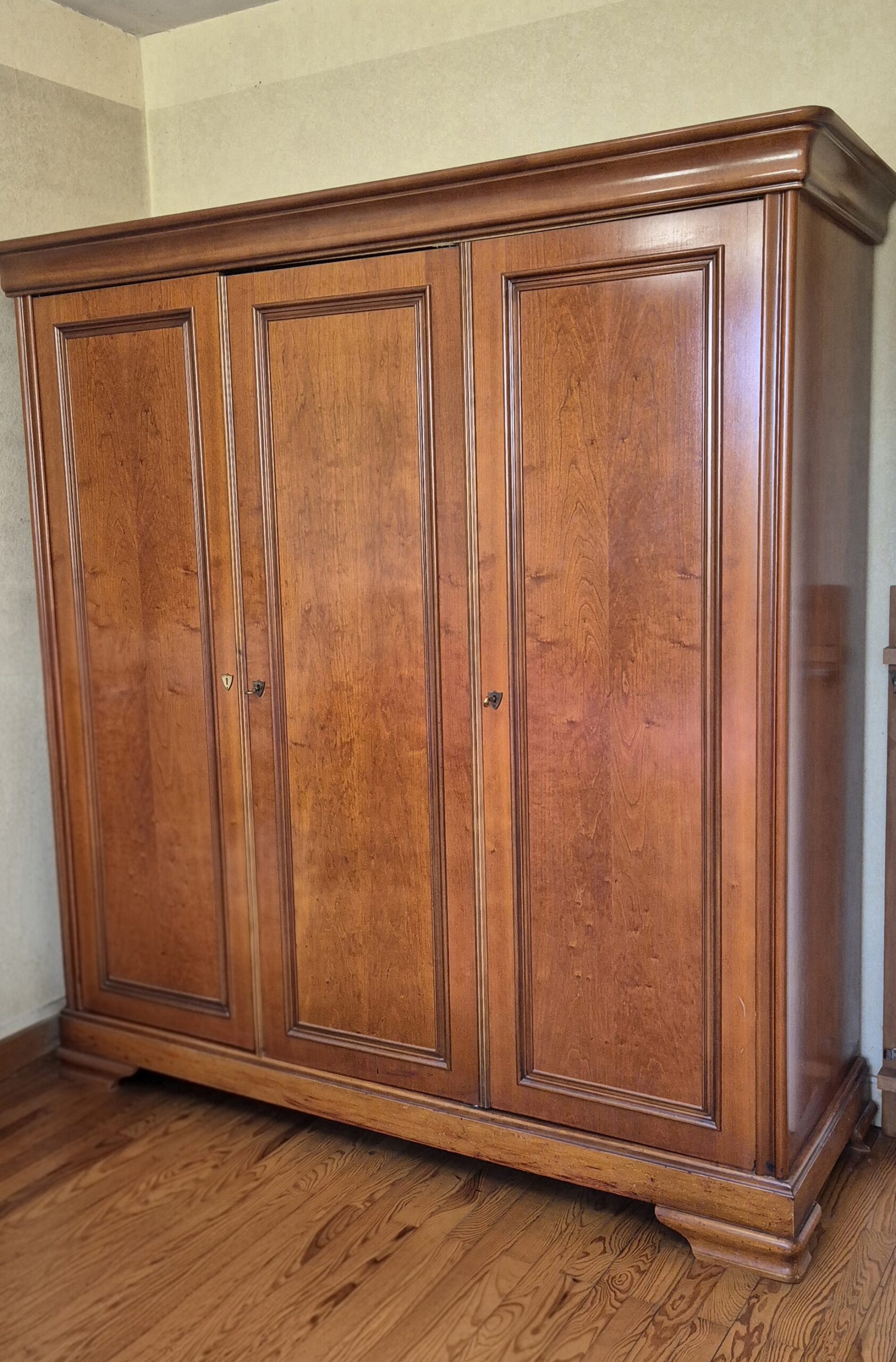 Grande armoire 3 portes à panneaux encadrés Grand volume rangement Merisier massif. Belle finition vernie/cirée Style néo-classique . Années 1950-1970