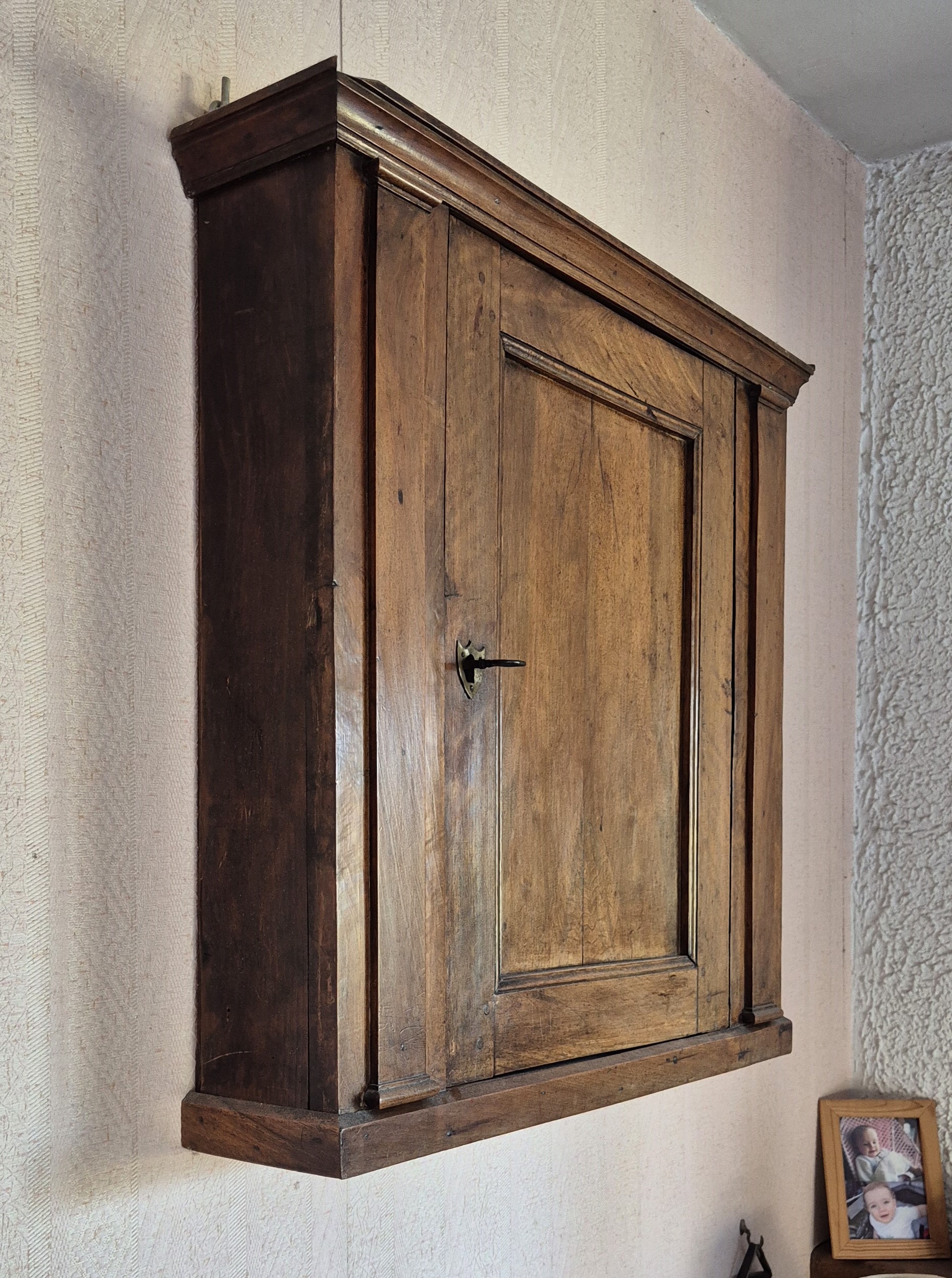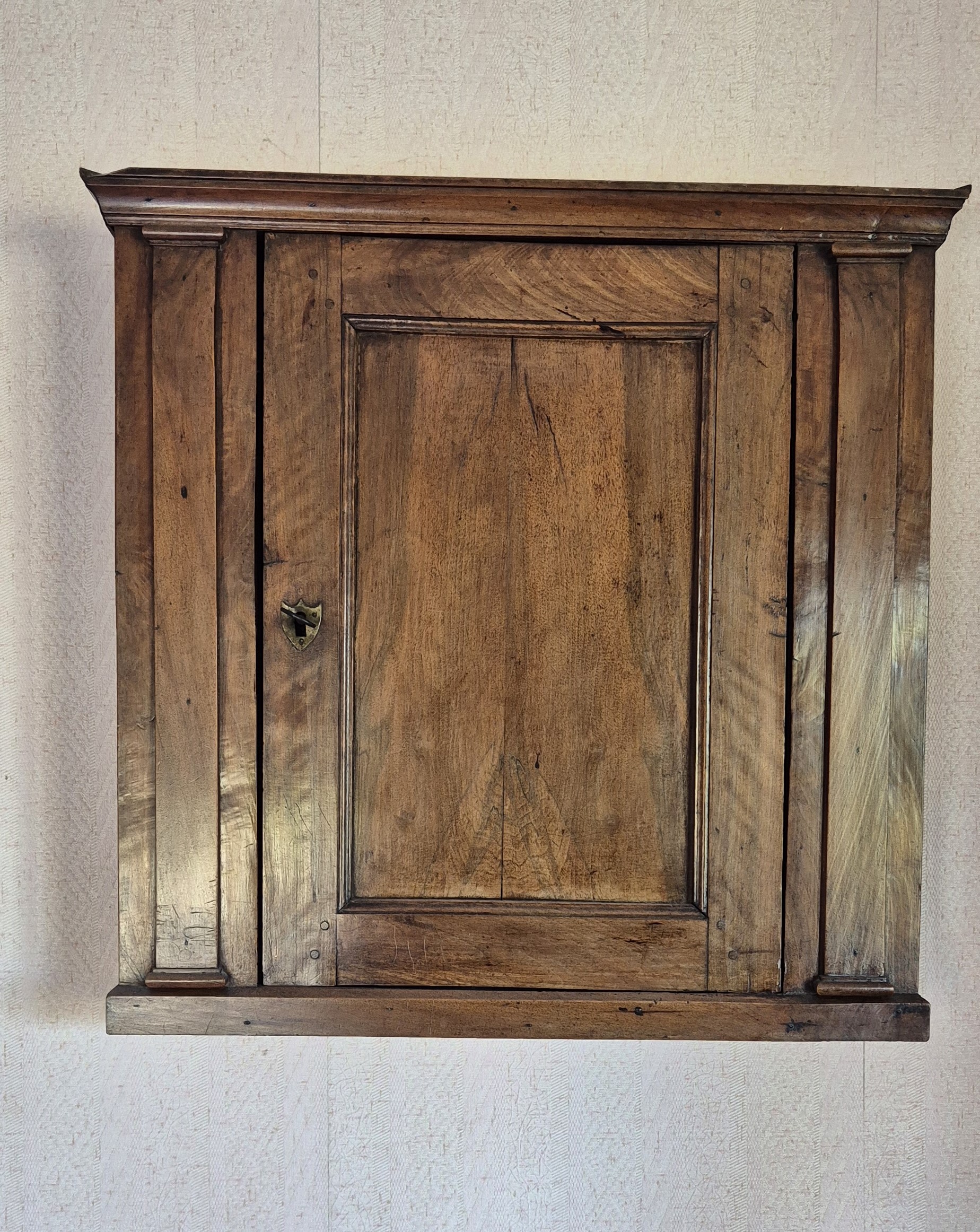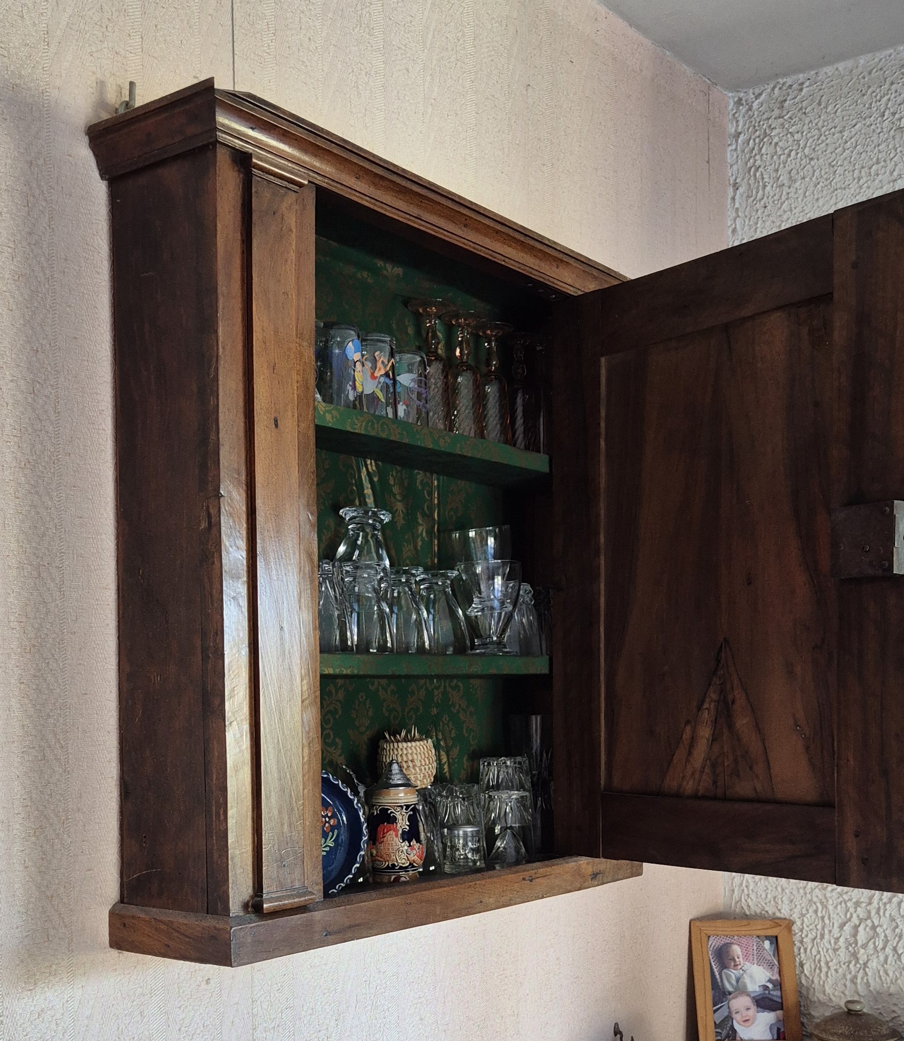 Cabinet mural d’époque Noyer massif Assemblages anciens d’origine T&M visibles Papier peint intérieur d’époque motifs damassés vert/or Format pratique suspendu