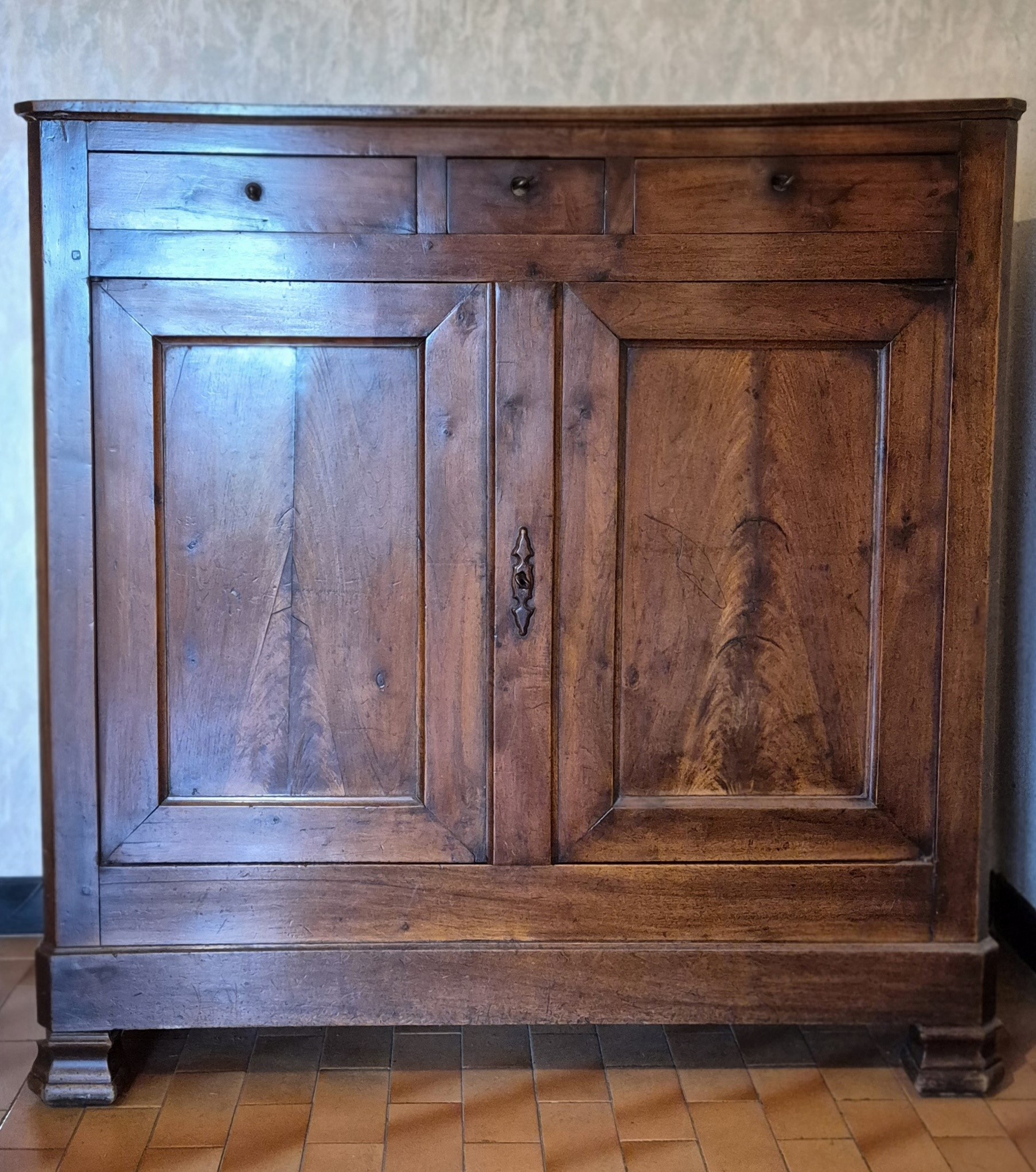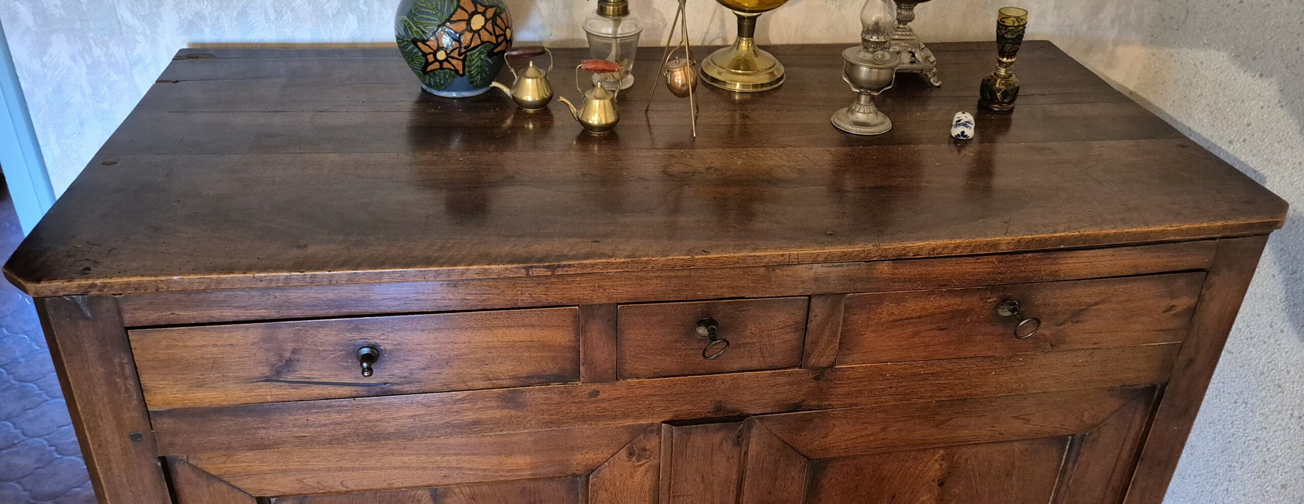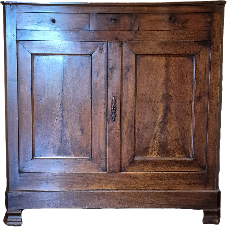 Buffet bas 2 portes + 3 tiroirs, noyer massif. Pieds cubes massifs style Empire/Directoire Intérieur tapissé papier Format généreux = volume rangement important Grand plateau massif Construction traditionnelle robuste