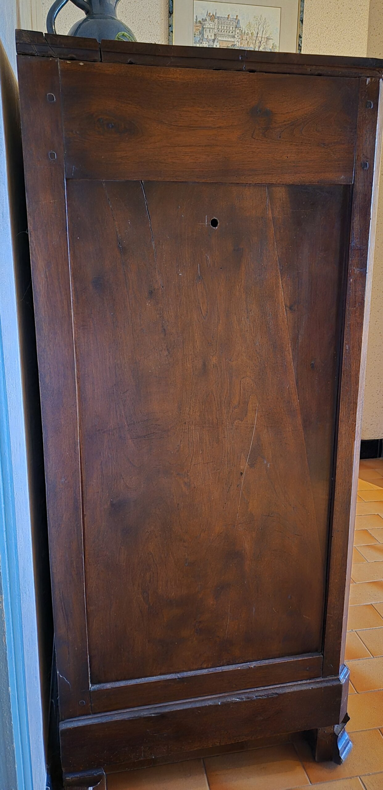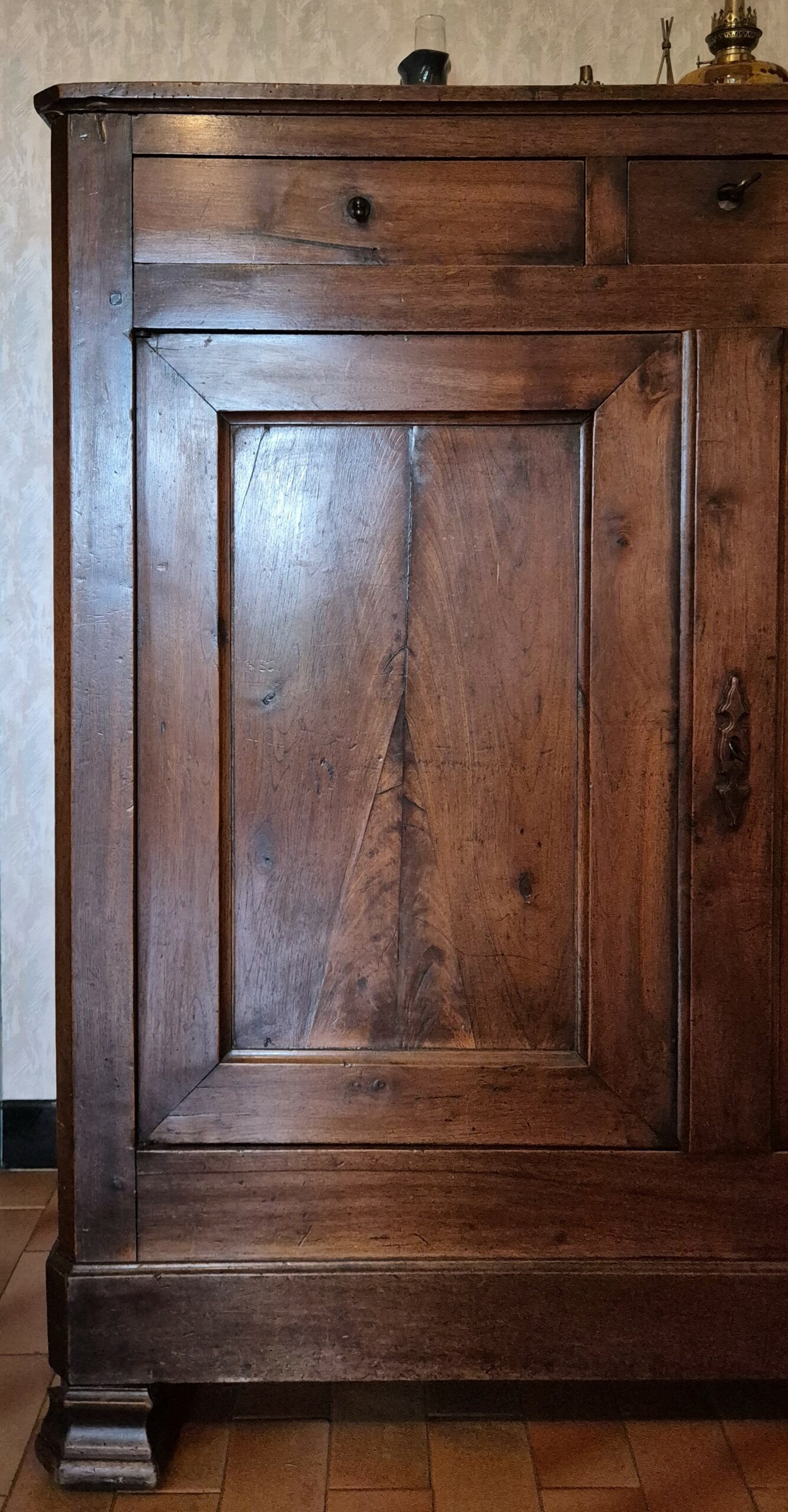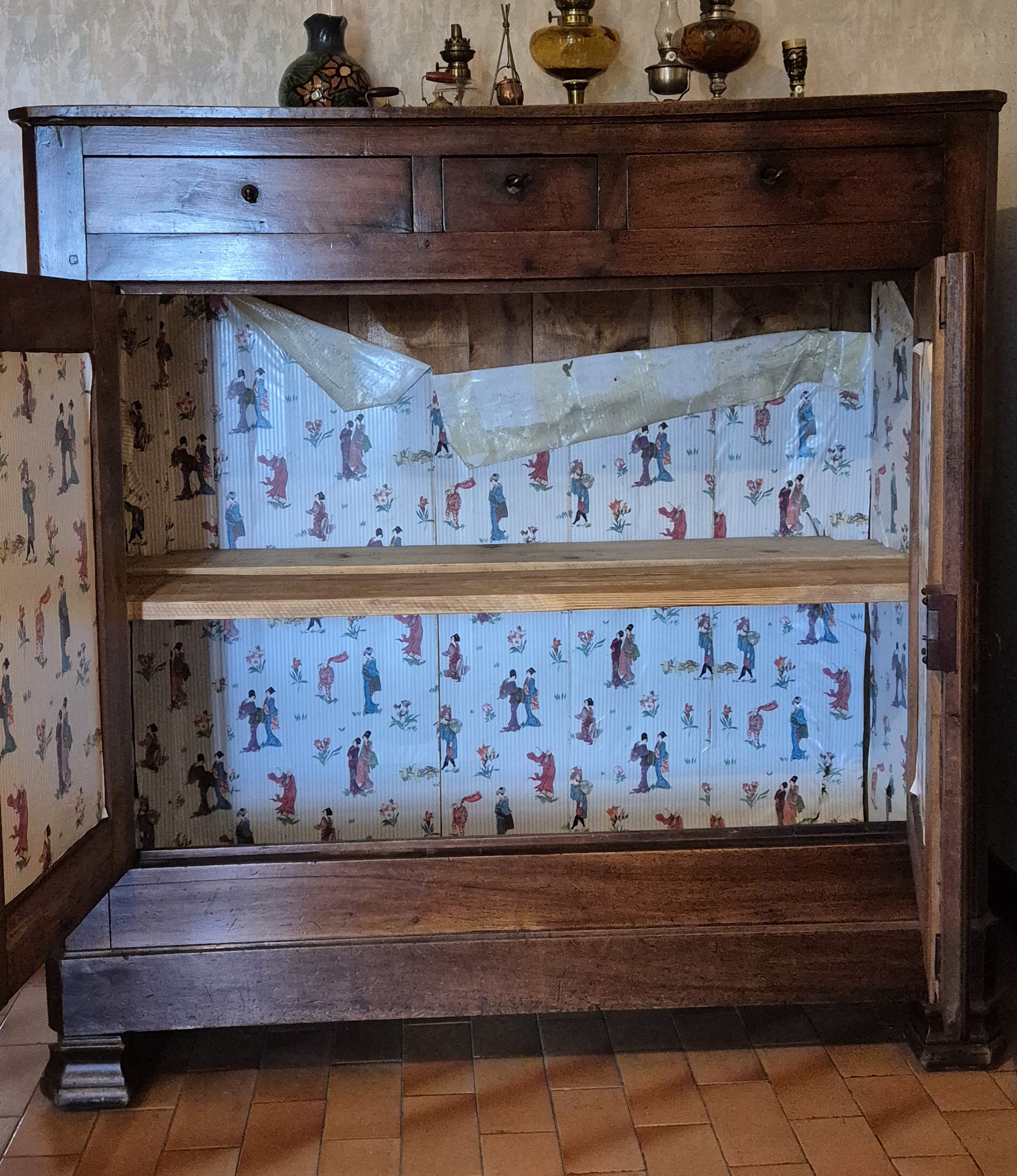 Buffet bas 2 portes + 3 tiroirs, noyer massif. Pieds cubes massifs style Empire/Directoire Intérieur tapissé papier Format généreux = volume rangement important Grand plateau massif Construction traditionnelle robuste