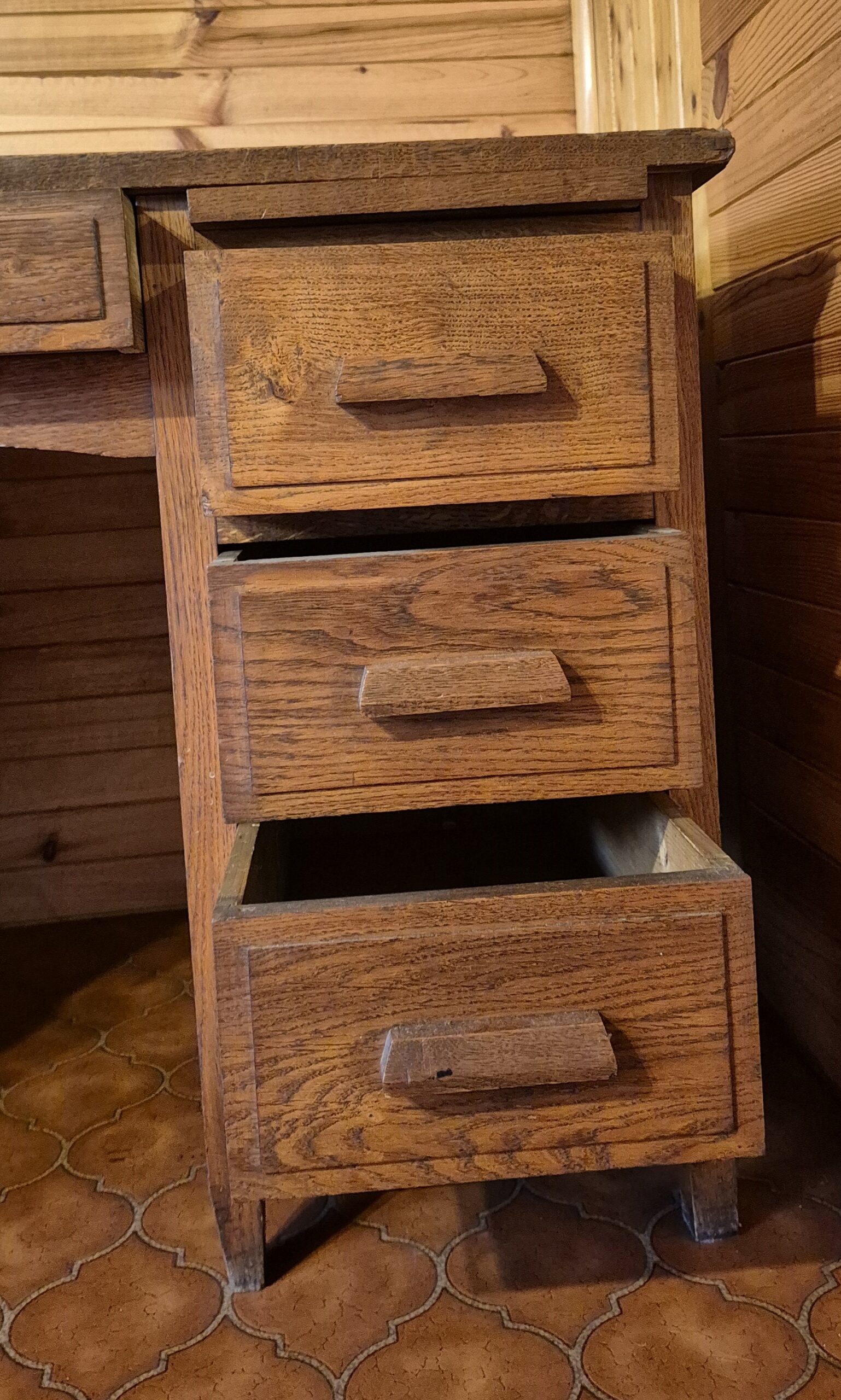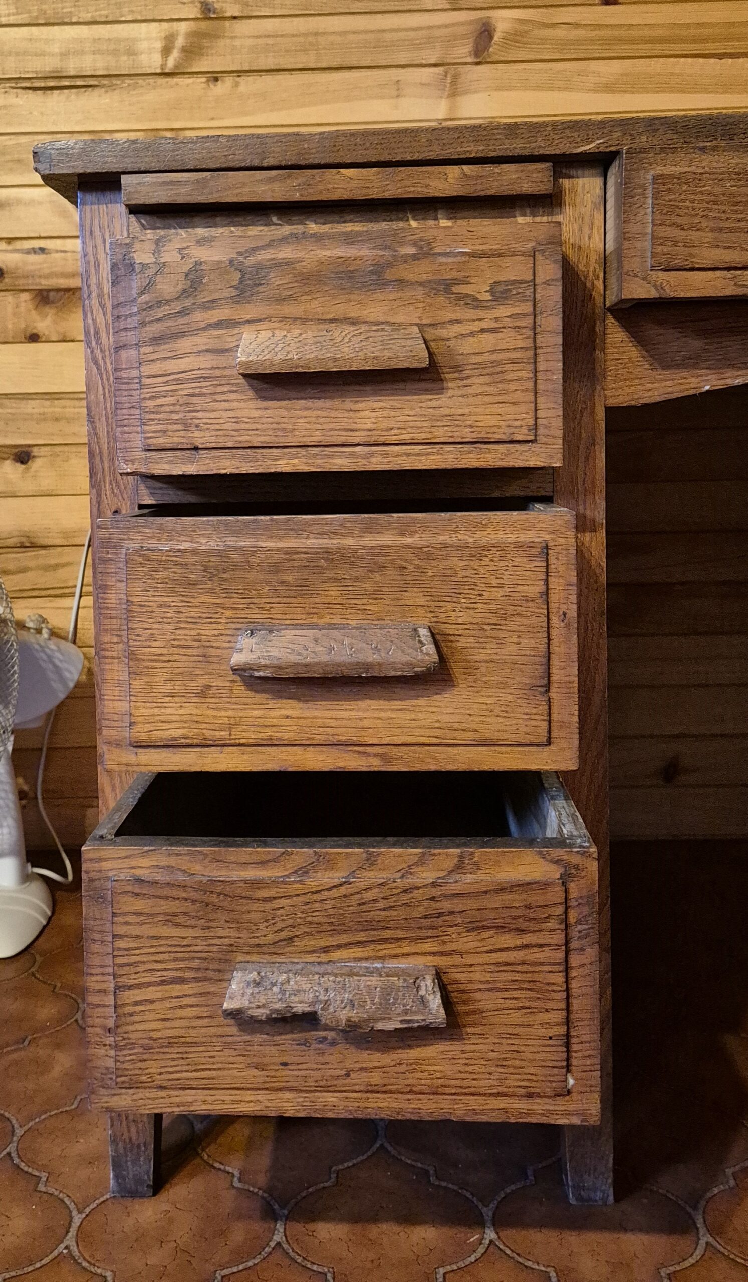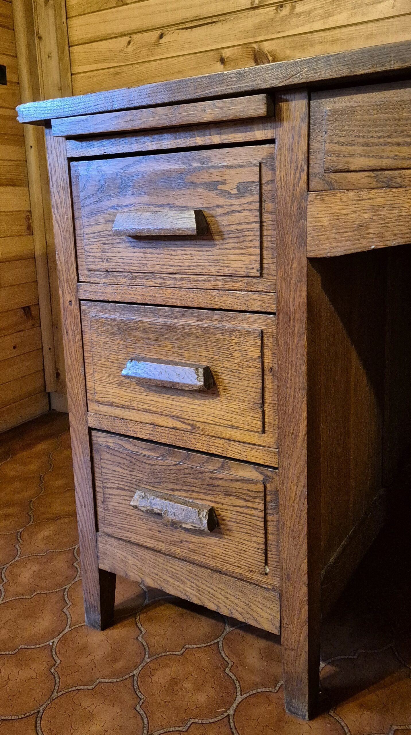 Bureau ancien administratif, chêne massif intégral. Construction traditionnelle début XXe. 7 tiroirs : 3+1+3 Poignées sculptées bois intégrées