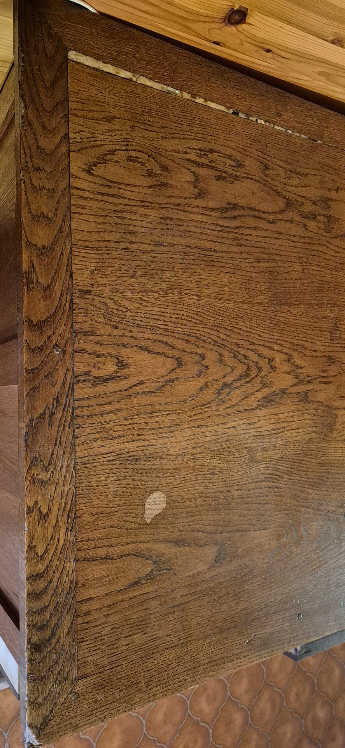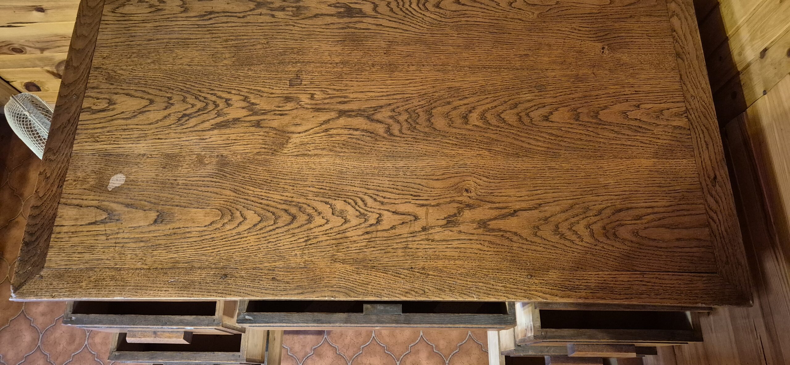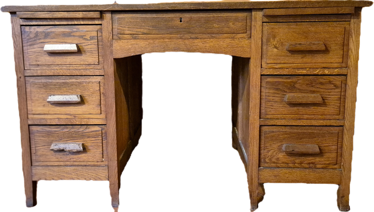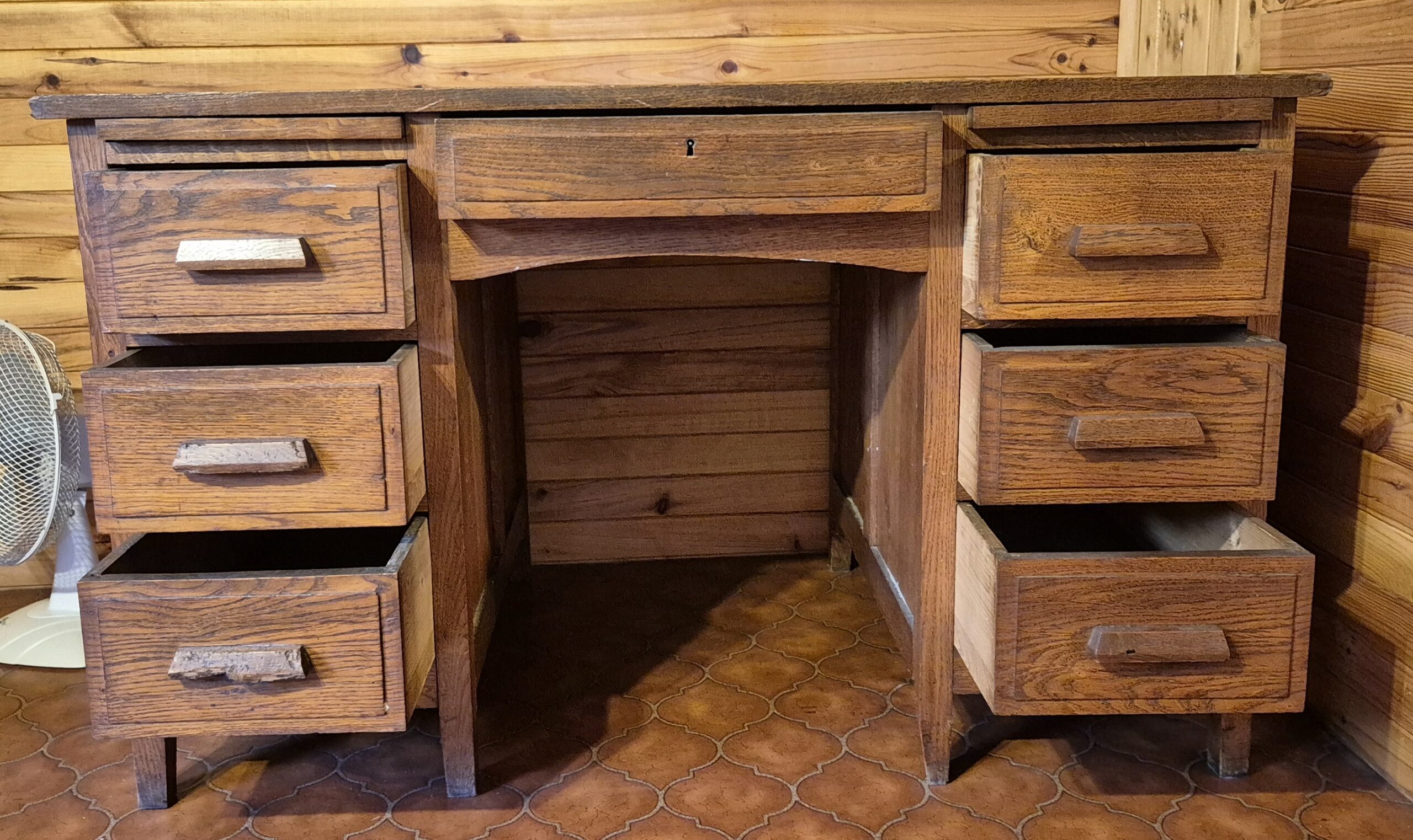 Bureau ancien administratif, chêne massif intégral. Construction traditionnelle début XXe. 7 tiroirs : 3+1+3 Poignées sculptées bois intégrées