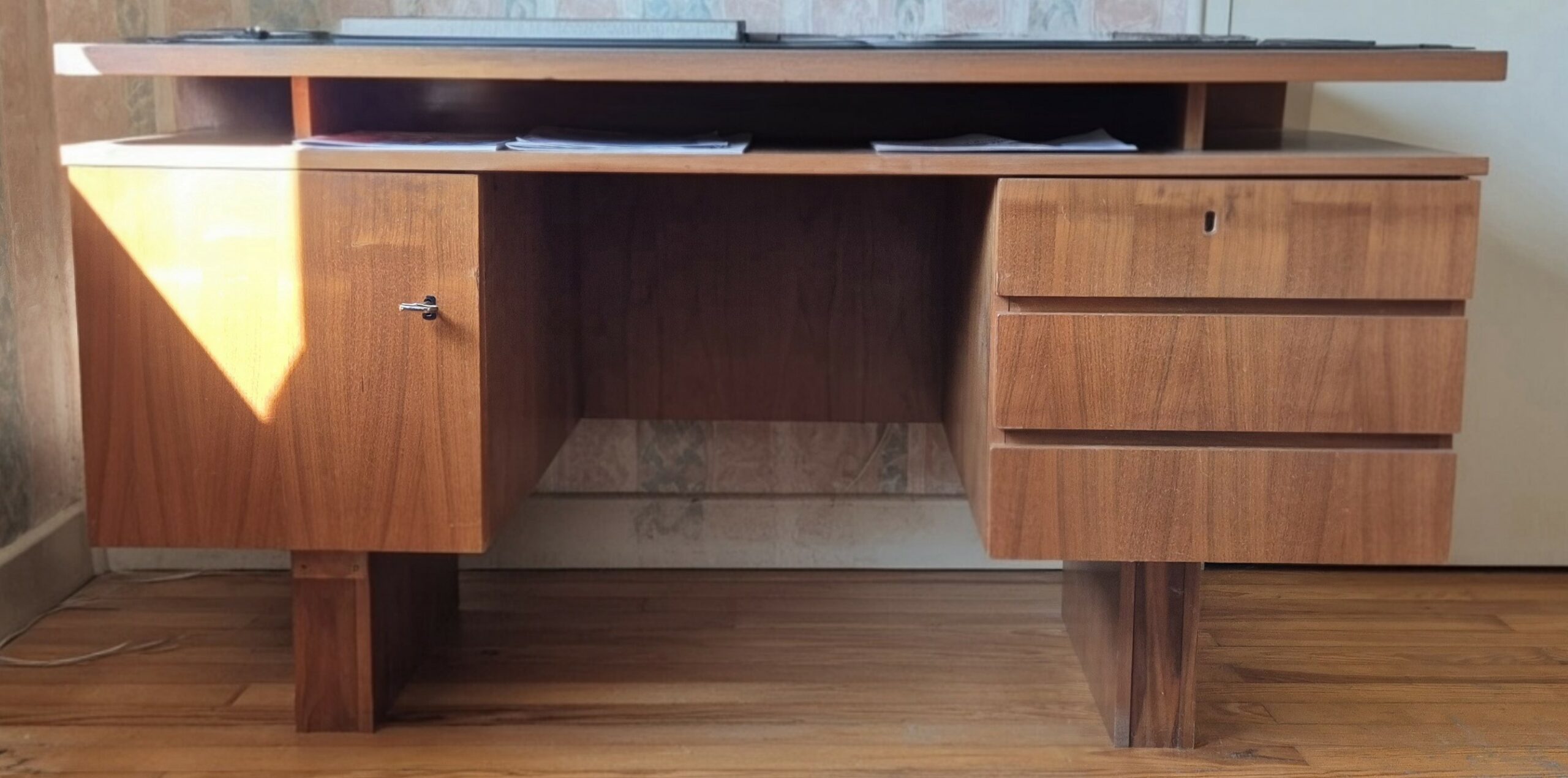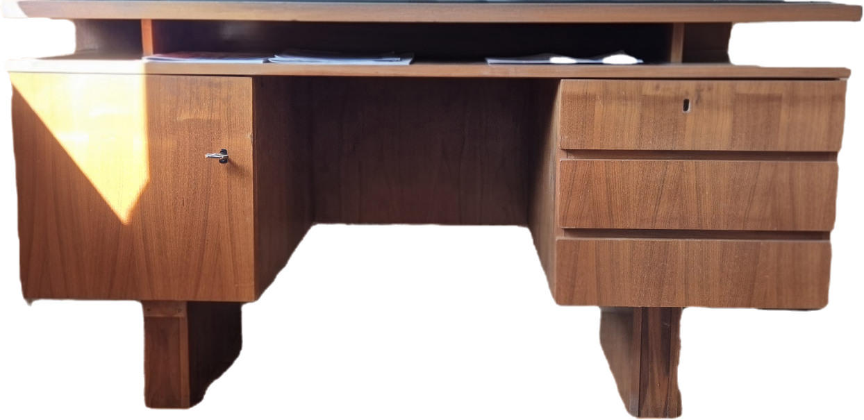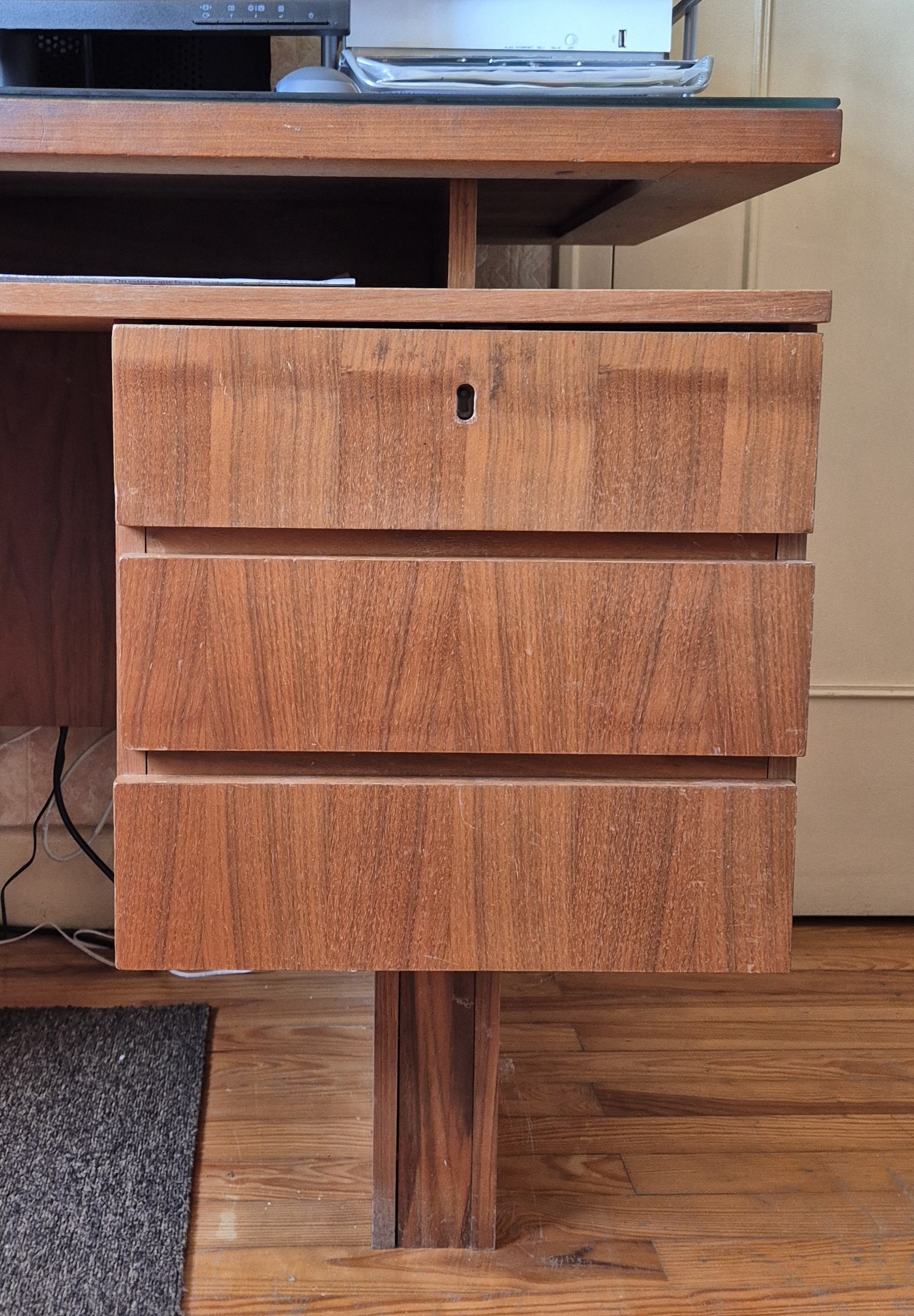 Bureau design mid-century, placage teck sur composite. Ligne épurée seventies. Plateau verre de protection 1 porte et 3 tiroirs Niche centrale