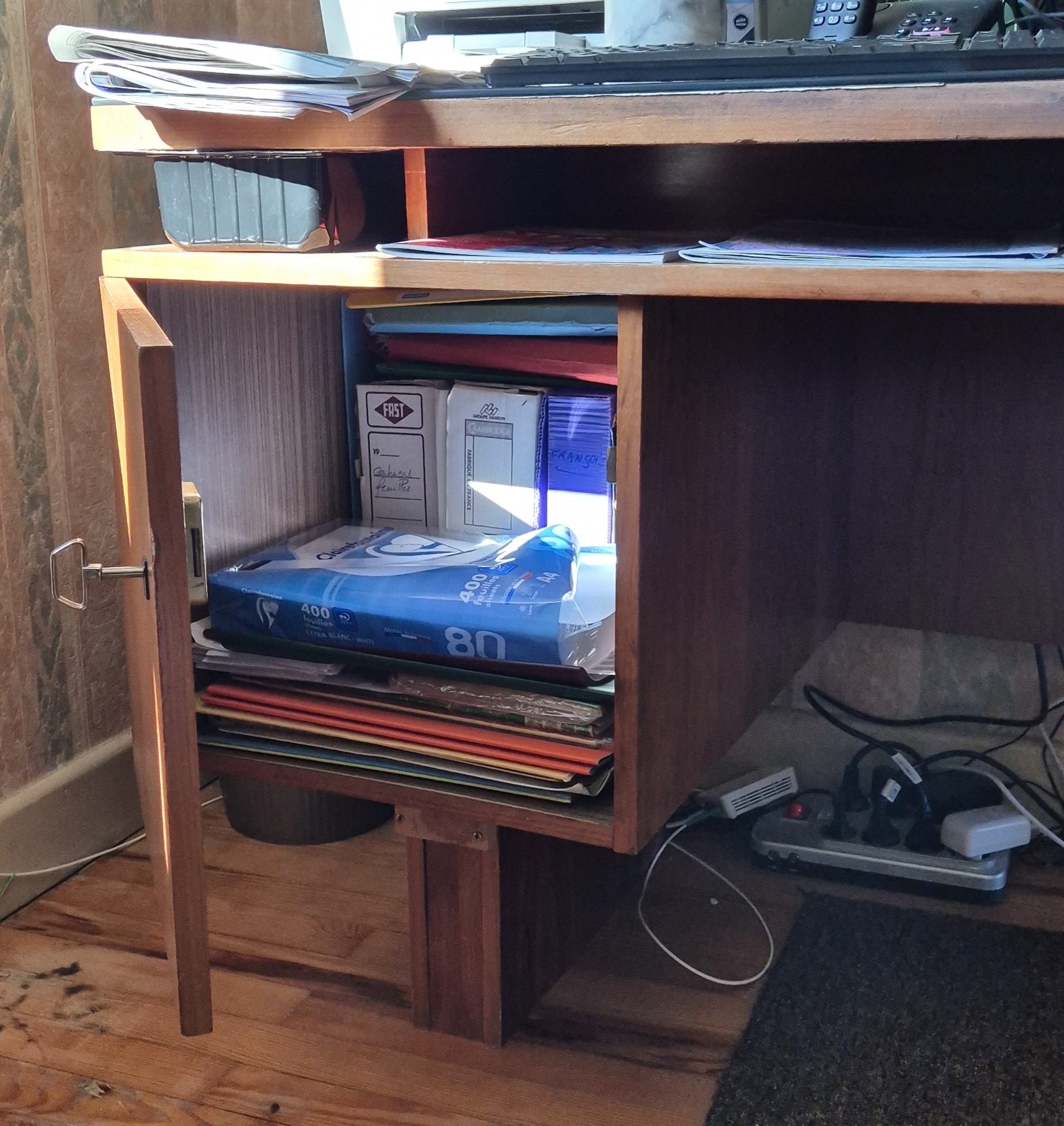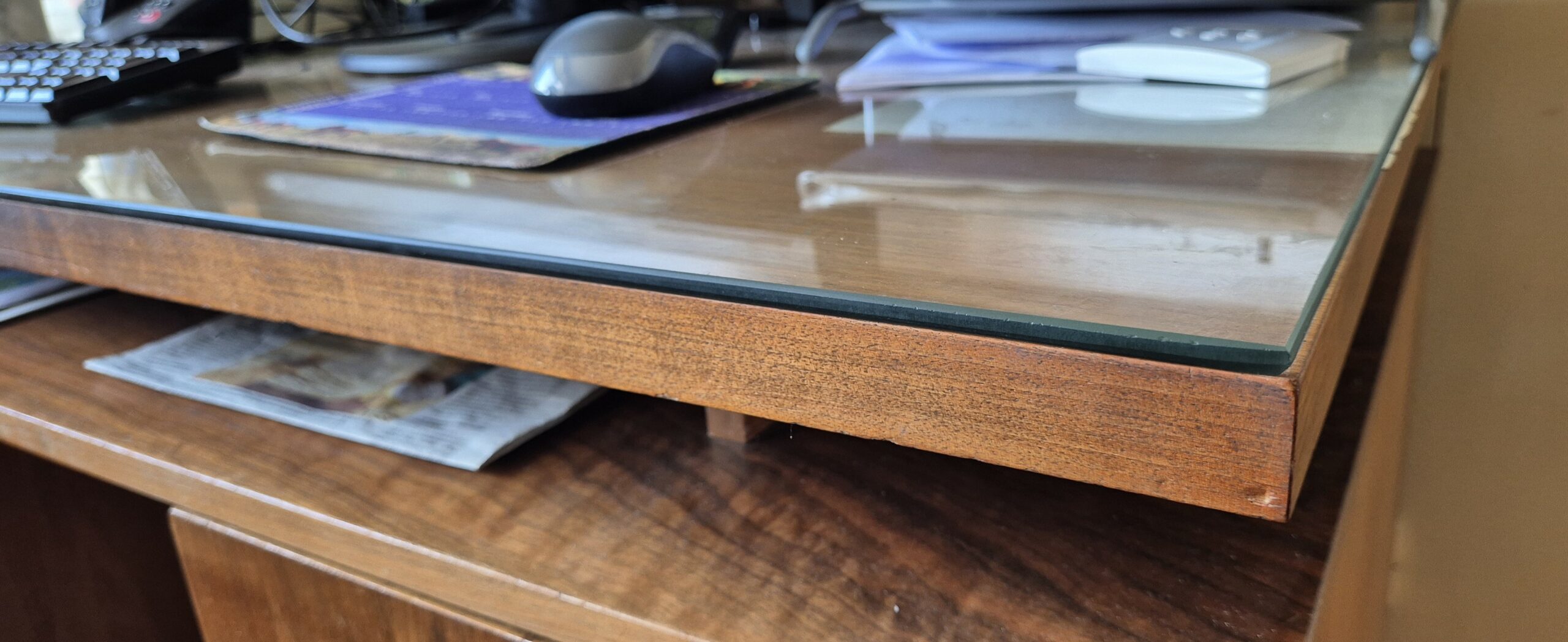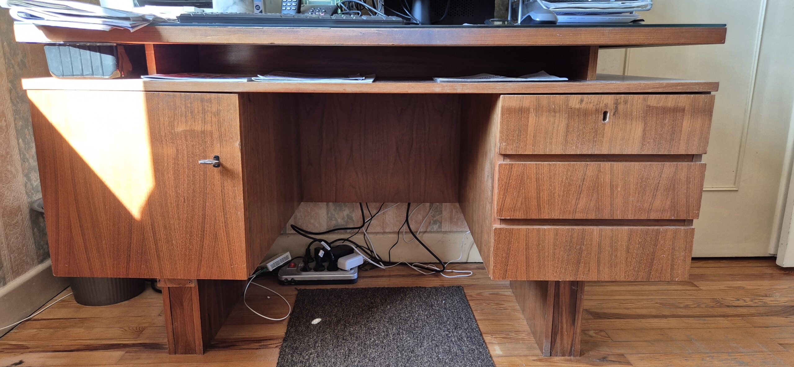 Bureau design mid-century, placage teck sur composite. Ligne épurée seventies. Plateau verre de protection 1 porte et 3 tiroirs Niche centrale