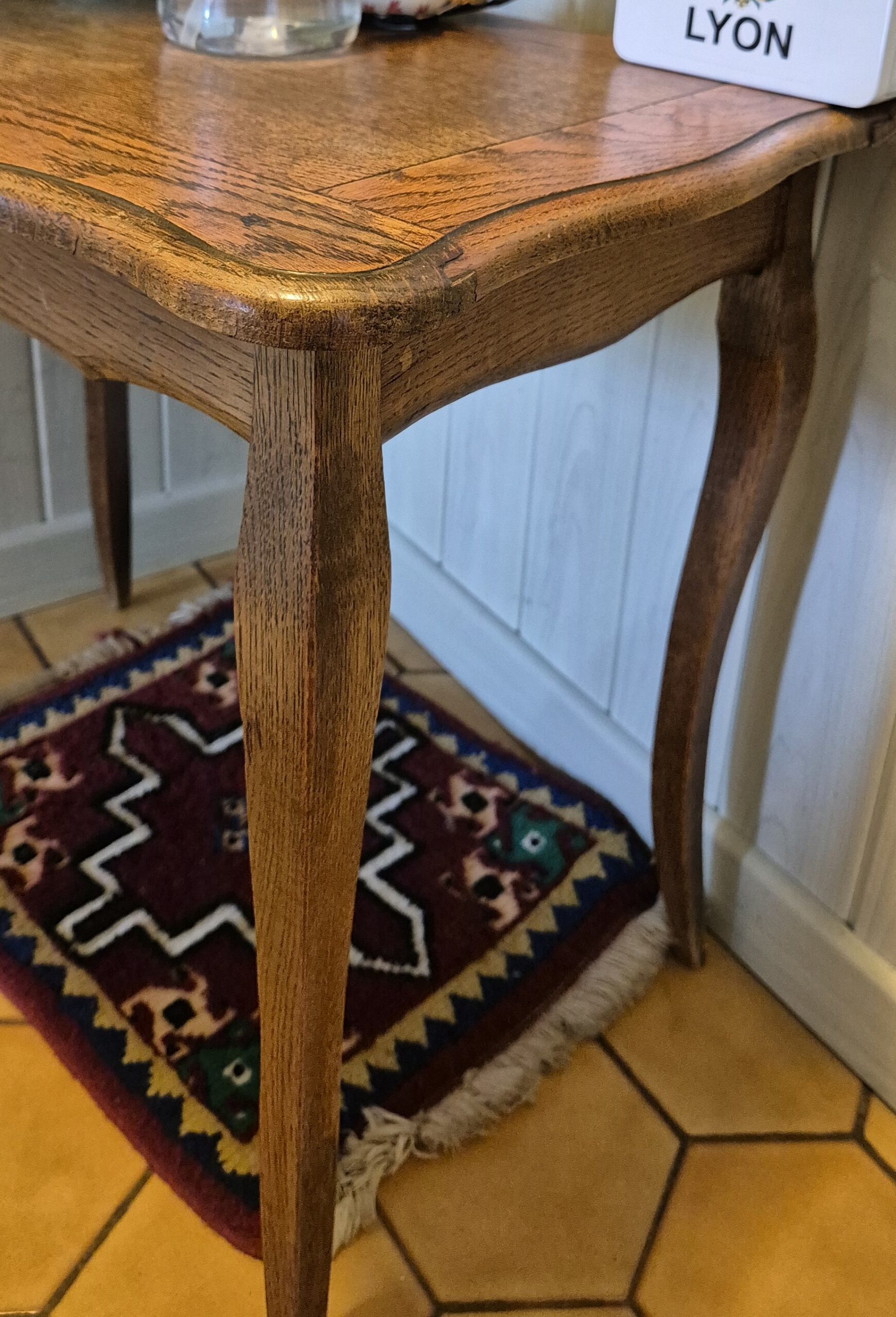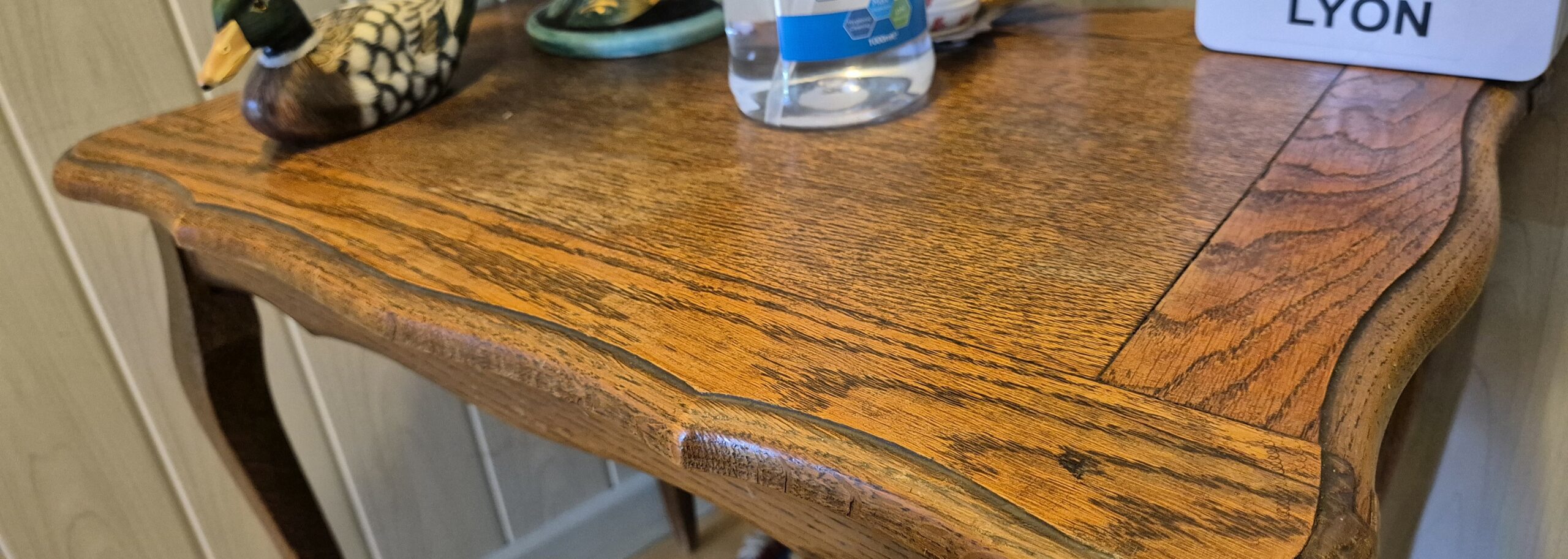 Console en chêne massif, début XXe siècle, style Louis XV. Pieds galbés en cabriole, plateau aux bords travaillés. Idéal en console d’entrée ou meuble d’appoint.