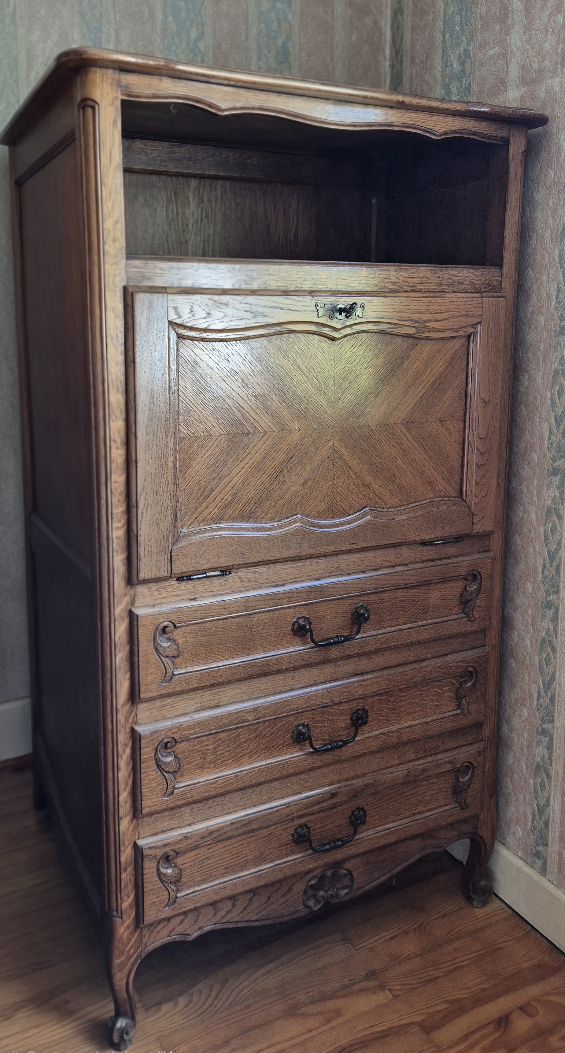 Secrétaire en chêne massif, début XXe siècle, style Louis XV provincial.
