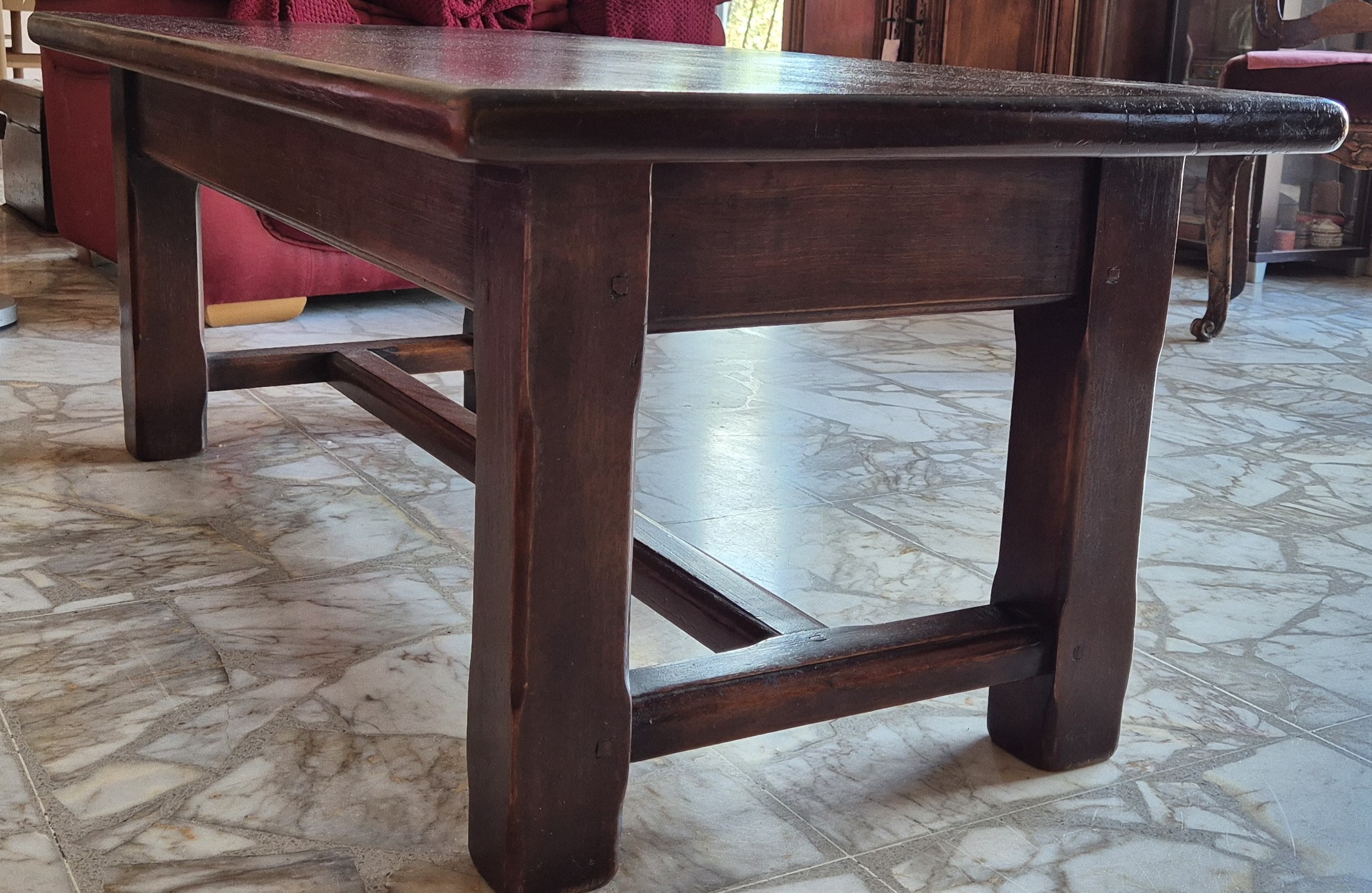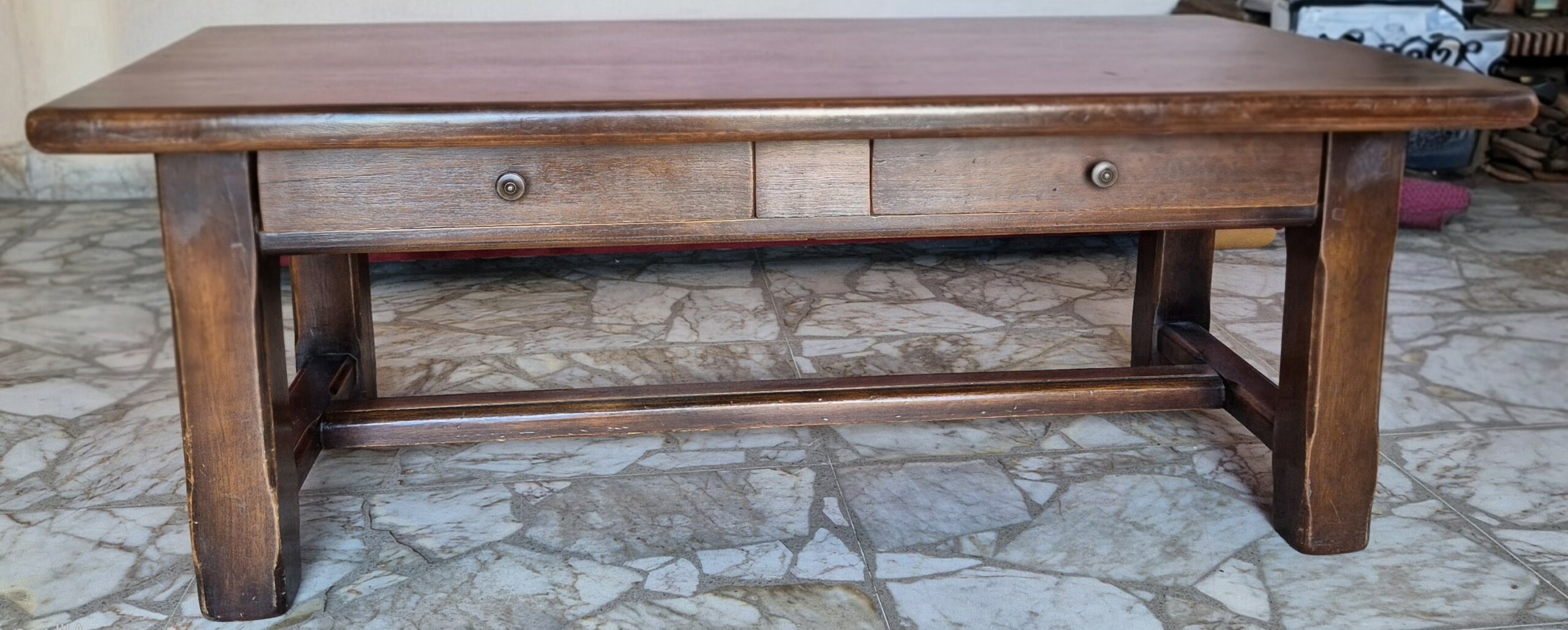 Table basse rectangulaire, probablement en chêne massif. 2 tiroirs boutons ronds métalliques. Construction traditionnelle robuste. Finition vernie/cirée brun foncé.