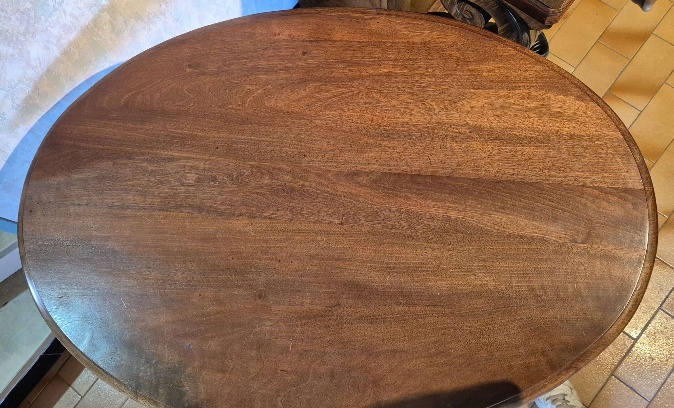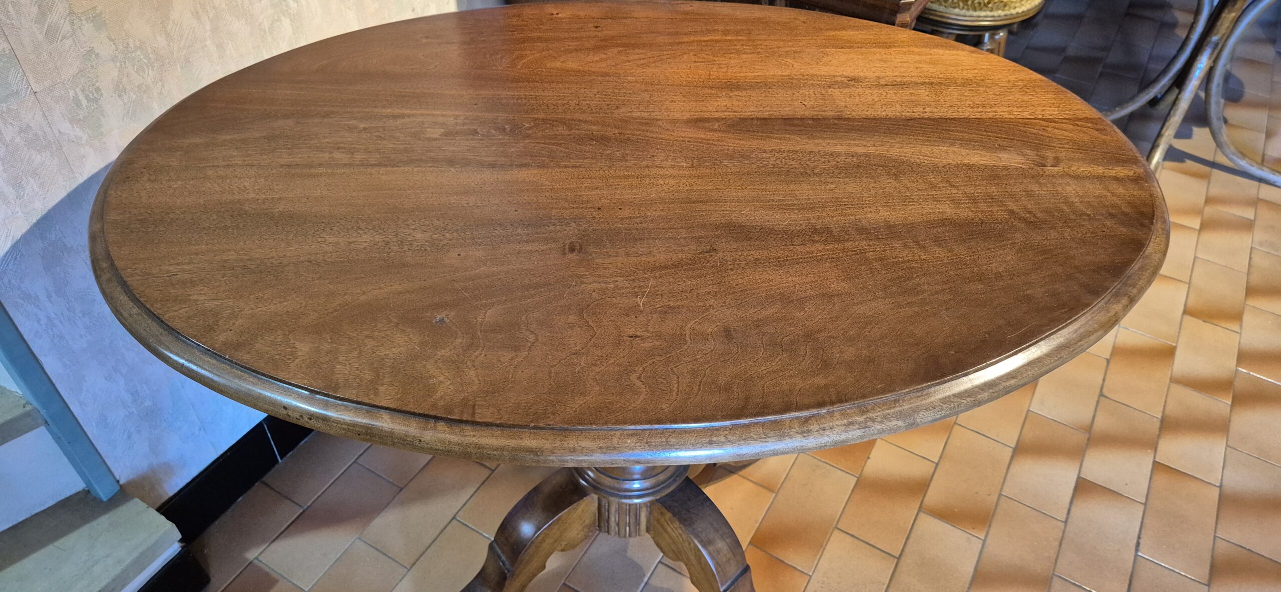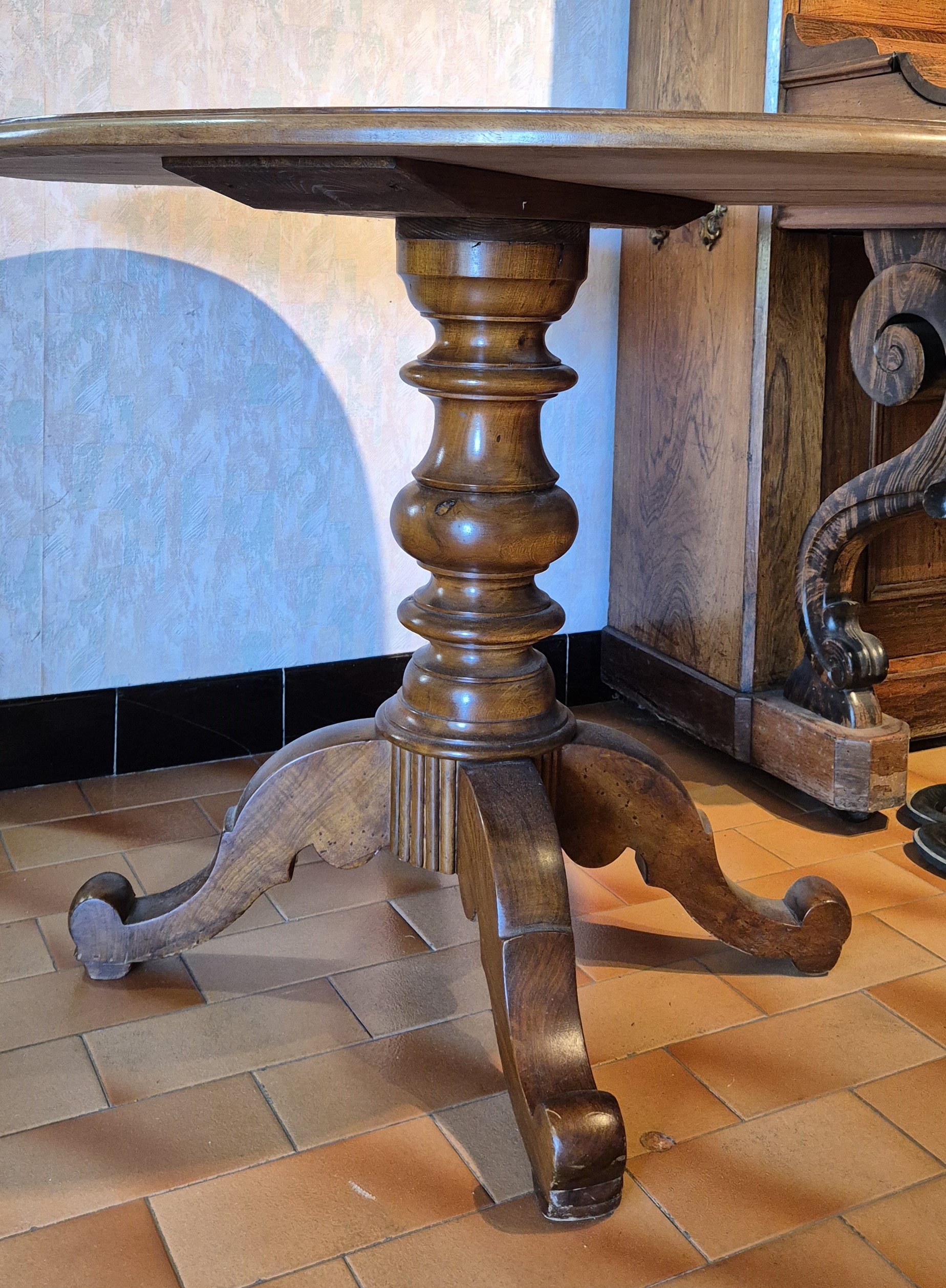 Table plateau oval pied central, noyer massif. Fût richement tourné + pieds tripodes volutes. Style Louis-Philippe/Restauration. Fin XIXe siècle