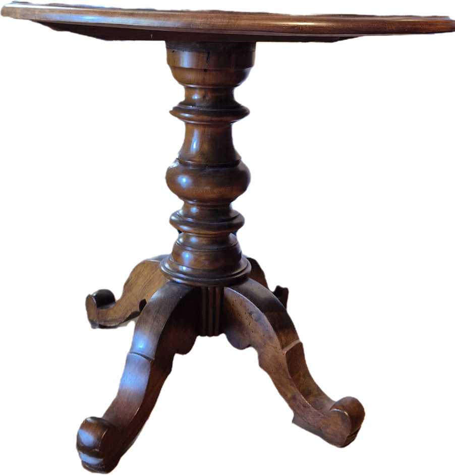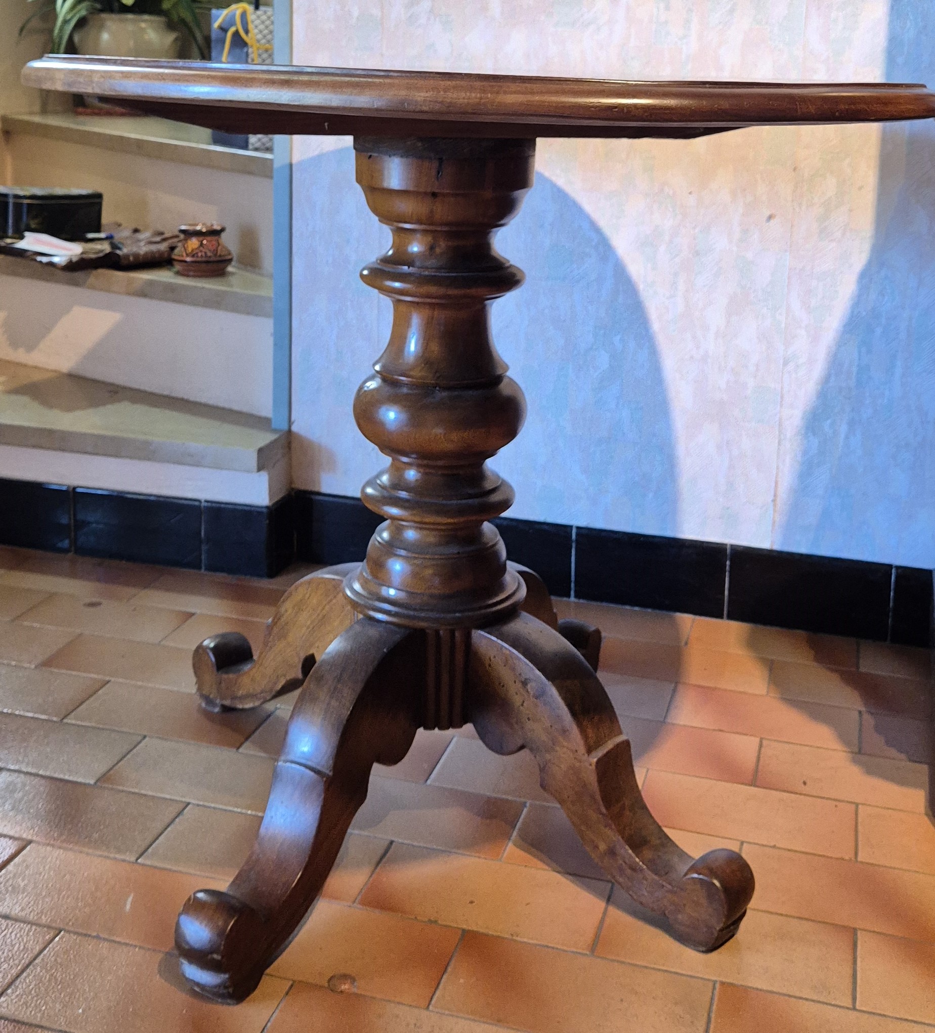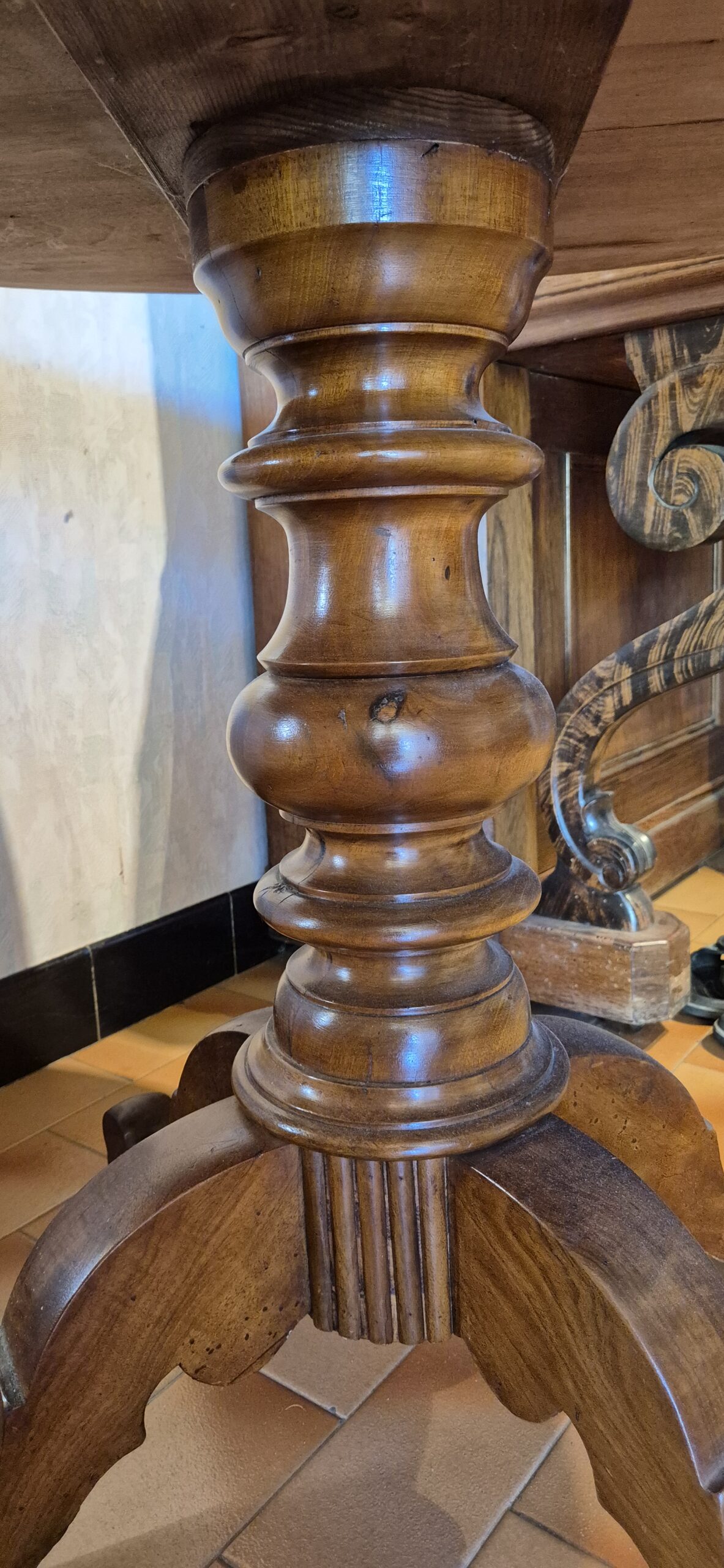 Table plateau oval pied central, noyer massif. Fût richement tourné + pieds tripodes volutes. Style Louis-Philippe/Restauration. Fin XIXe siècle