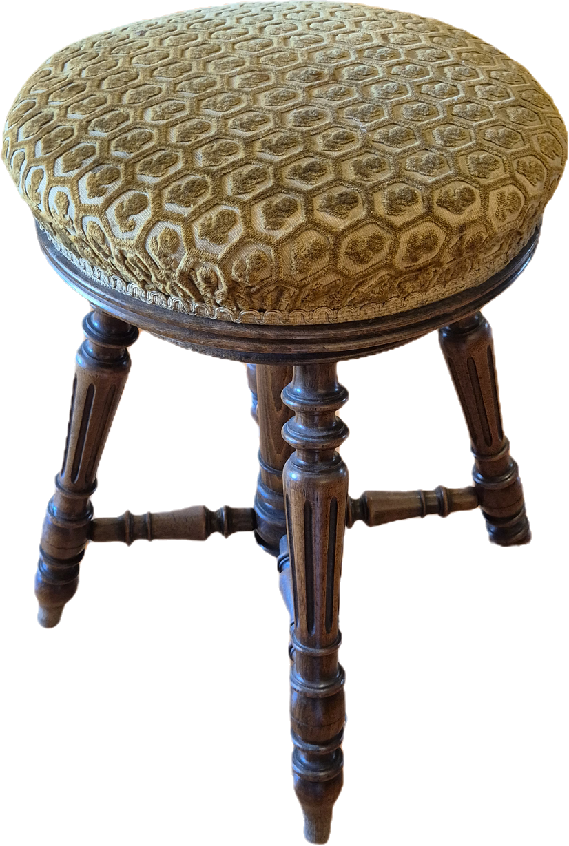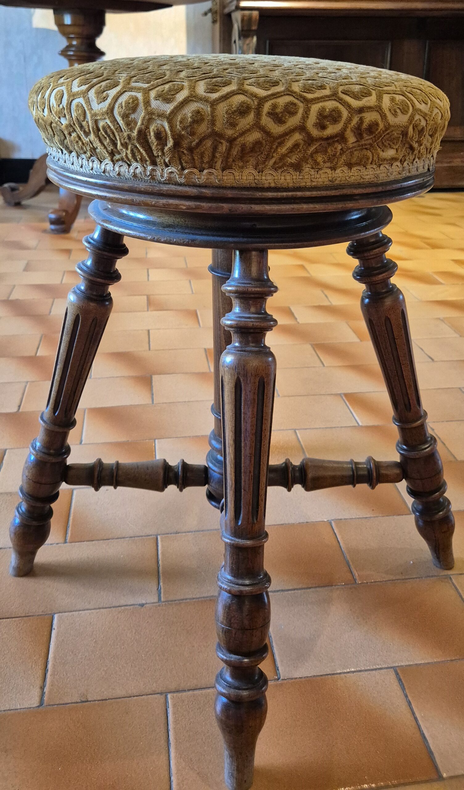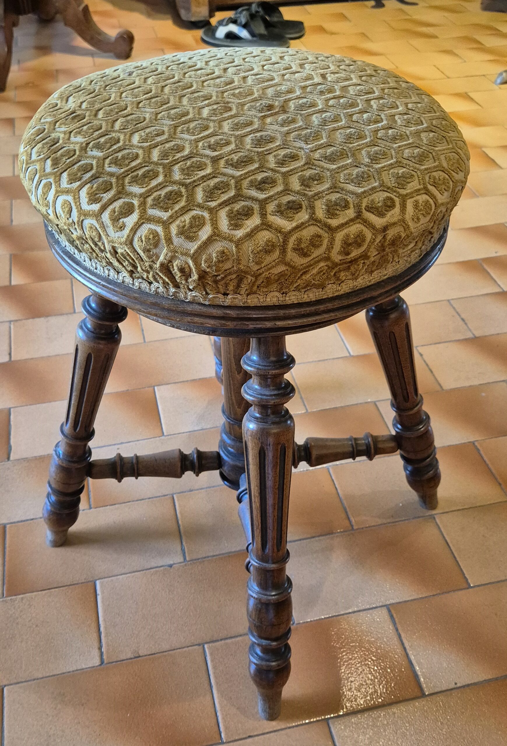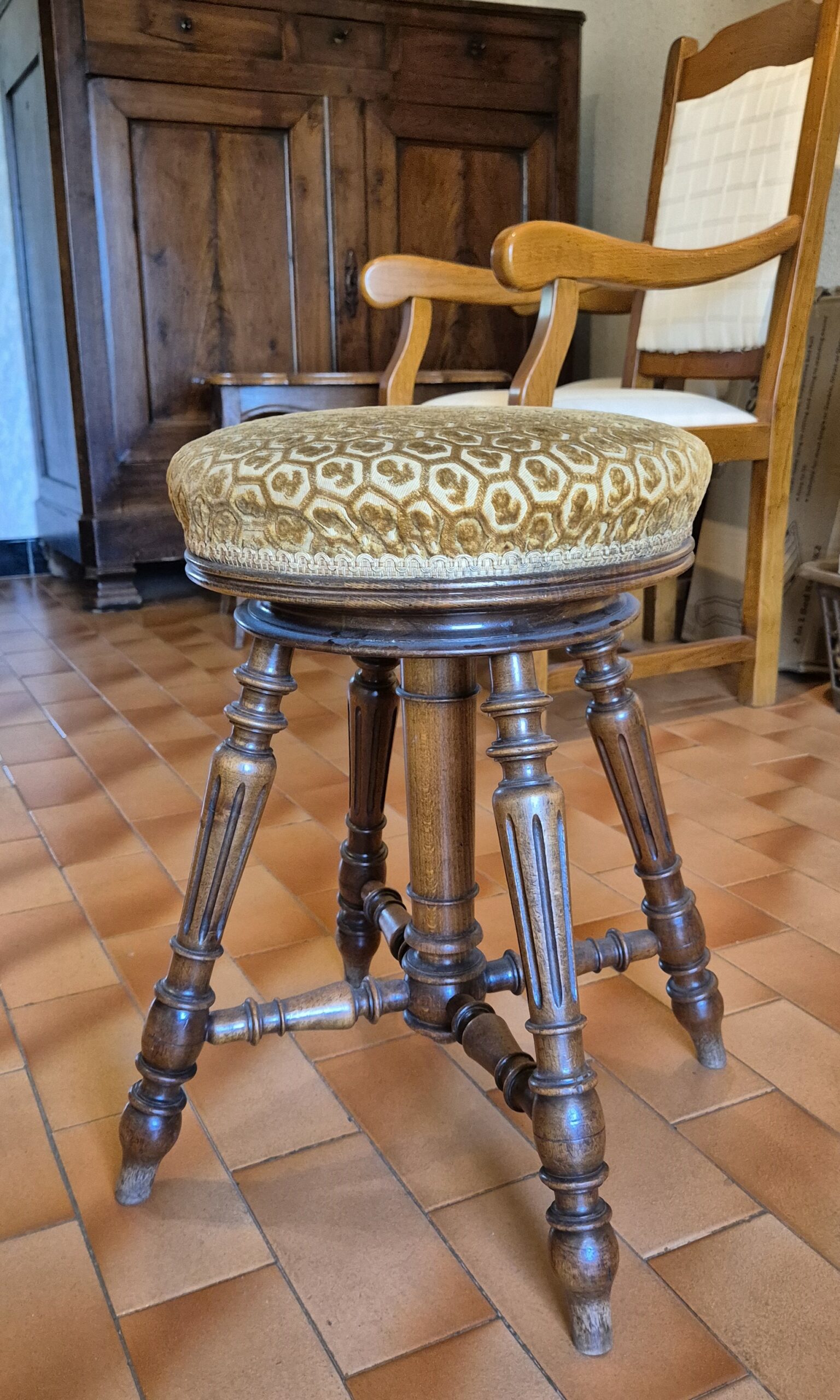 Tabouret tournant, bois massif richement tourné. Entretoise X (croix de Saint-André) Assise velours motifs d’époque, passementerie galon décoratif
